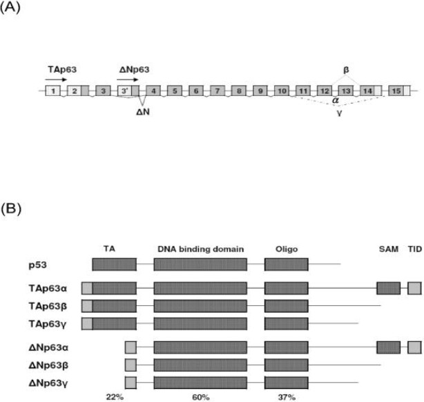 Epidermis is composed mainly of keratinocytes and is the major barrier of human body. The development and maintenance of normal epithelial structures and functions require the transcription factor p63. The p63 gene encodes proteins with structures similar to that of p53, including an N-terminal transactivation (TA) domain, a DNA-binding domain and a carboxy-oligomerization domain. TAp63 and ΔNp63 (p63 isoforms without TA domain) regulate a wide range of target genes that are important for embryonal development and epithelial integrity. Mutations of p63 gene cause epidermal abnormalities characterized by ectodermal dysplasia. Recent reports have indicated that p63 plays important role in tumorigenesis as well. However, the relative importance of TAp63 and ΔNp63 in epidermal development and tumorigenesis remains mostly unclear and awaits further investigation. In this review, we summarize the current knowledge on the structure and function of p63 and its isoforms.