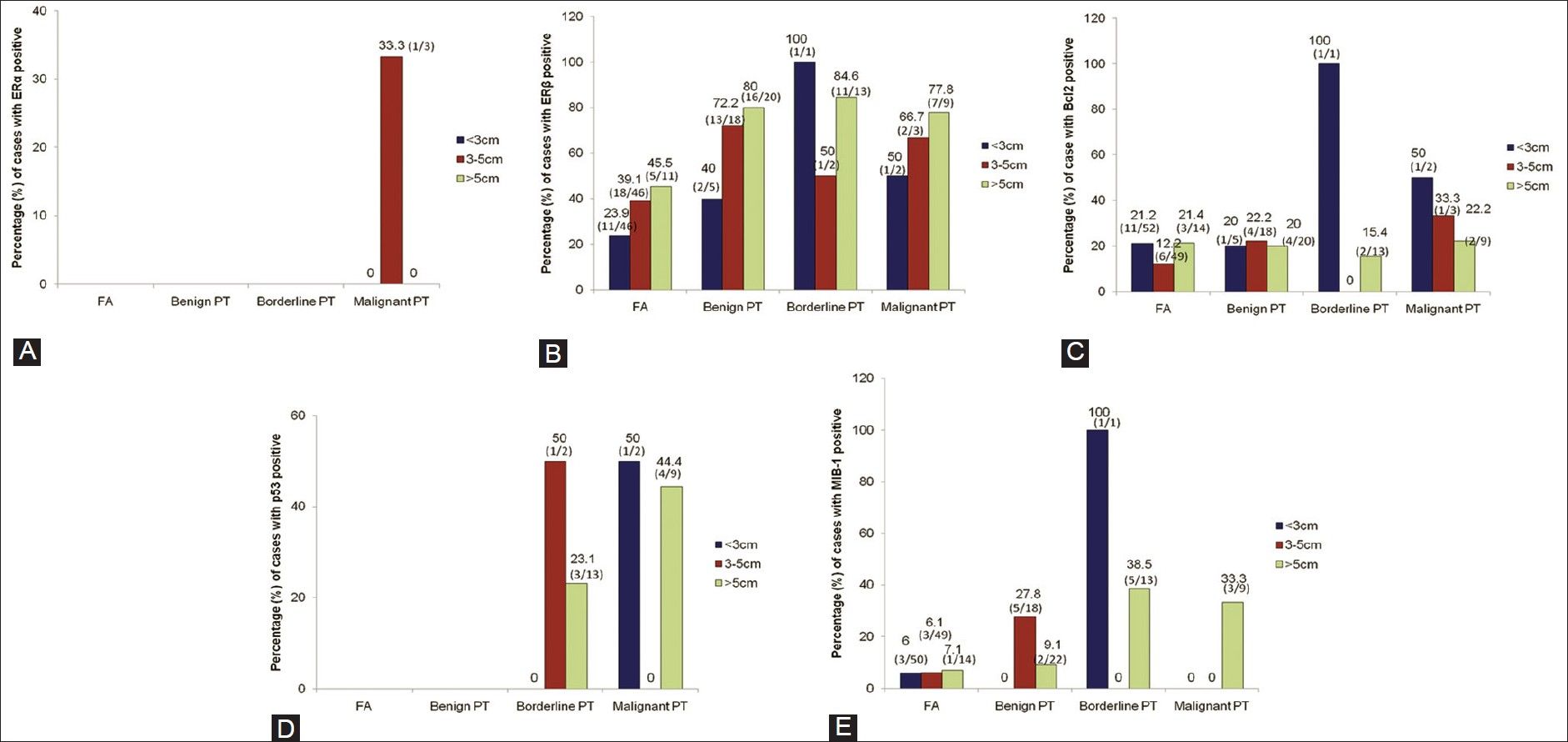Results: ERβ (p <0.001), and p53 (p=0.006) in the stromal component were associated with tumor size. p53 expression was significantly associated with both epithelial and stromal components of malignant PTs (p<0.05). In PT, the decreased expressions of p53 and MIB-1 were significantly different with positive Bcl2 protein expression in epithelial component (p=0.000). Besides, MIB-1 was also found to be associated with ERα and ERβ in stromal component (p=0.000).
