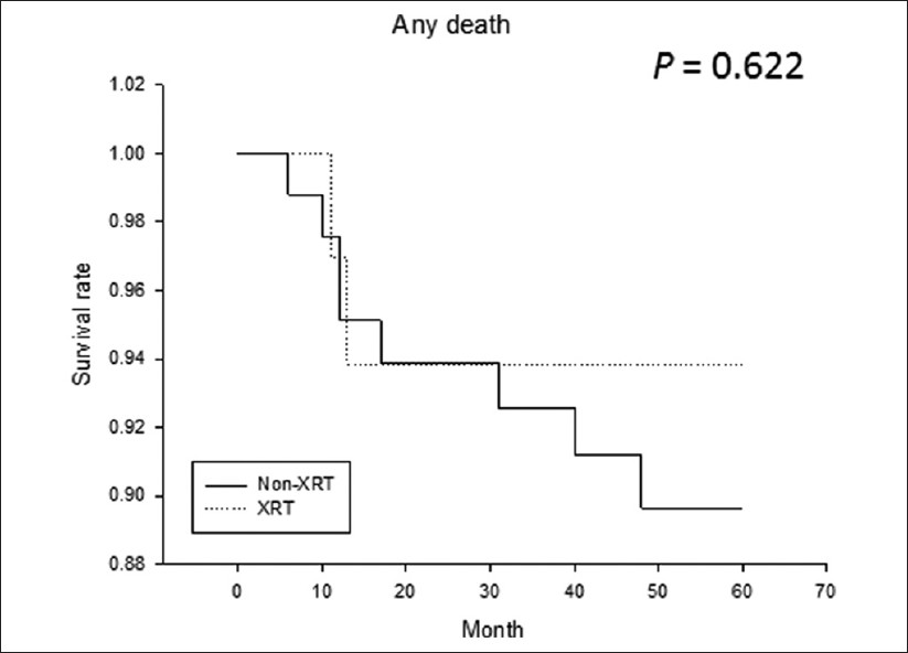 Results: The mean age of XRT patients was significantly lesser than that of non-XRT patients (61 ± 8 vs. 71 ± 8, p < 0.001). There was significantly less coronary artery disease and other cardiovascular co-morbidities in XRT patients. No significant differences were noted in the composite 30-day ipsilateral stroke/myocardial infarction/mortality (XRT: 8.6% vs. non-XRT: 6%, p > 0.05) and 5-year freedom from mortality, ipsilateral recurrent stroke, and MACE (p > 0.05) between the two groups. Intra-stent carotid restenosis > 50% was significantly higher in the XRT group on follow-up.
