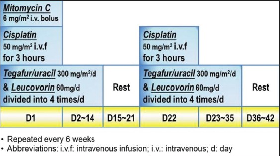 Methods: Patients with histologically proven non-keratinizing or undifferentiated nasopharyngeal carcinoma were prospectively enrolled from April 2002 to June 2005. Cisplatin 50 mg/m 2 on day 1, 22 and mitomycin C 6 mg/m 2 on day 1 were administered. Oral tegafur-uracil 300 mg/m 2 /day and oral leucovorin 60 mg/day were given on day 1-14 and day 22-35, respectively. Each cycle was repeated every 6 weeks. Primary and secondary endpoints are response rate and toxic profiles with survivals, respectively.