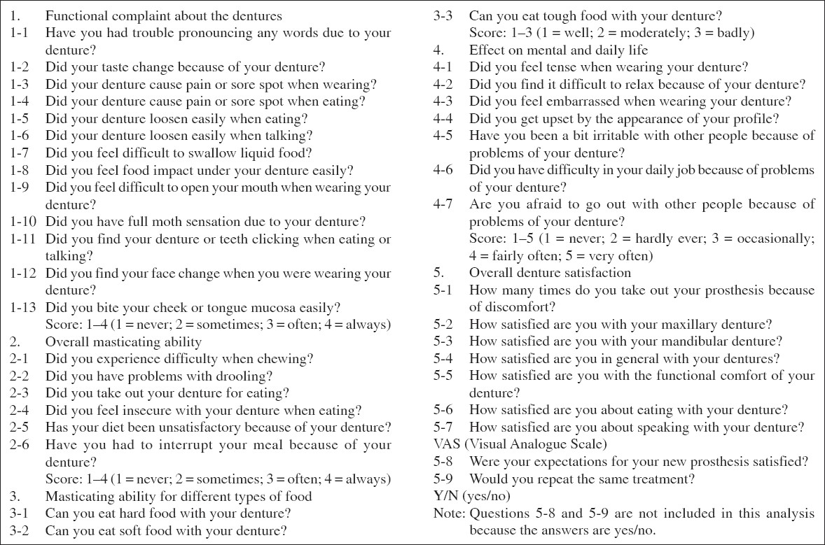 Methods: Among 85 completely edentulous patients, 60 were treated with four one-stage titanium implants and overdentures retained by a cast bar with extracoronal attachments. These patients constituted the experimental group, and were subsequently evaluated clinically over a period of up to 6 years. The other 25 patients constituted the control group and were treated with conventional complete dentures without implant retained. All the patients (n = 60) in the experimental group responded to questions on their experiences before and after treatment with the implant-retained overdentures. Sixty percent (n = 15) of the 25 patients in the control group responded to the questionnaire.
